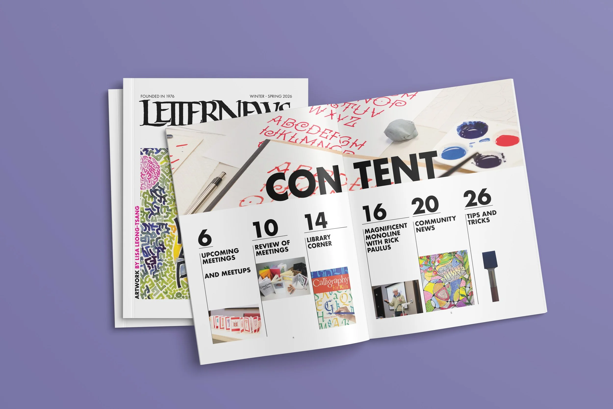 LetterNews is a biannual newsletter produced for the Society for Calligraphy & Handwriting and distributed both digitally and in print. It features articles, workshop and class listings, exhibition announcements, and updates on local and national calligraphy events.